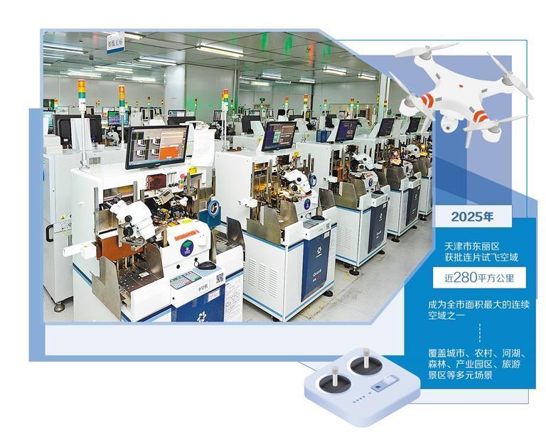 2025年,东丽区获批近280平方公里连片试飞空域,成为天津市面积最大的连续空域之一,覆盖城市、农村、河湖、森林、产业园区、旅游景区等多元场景。